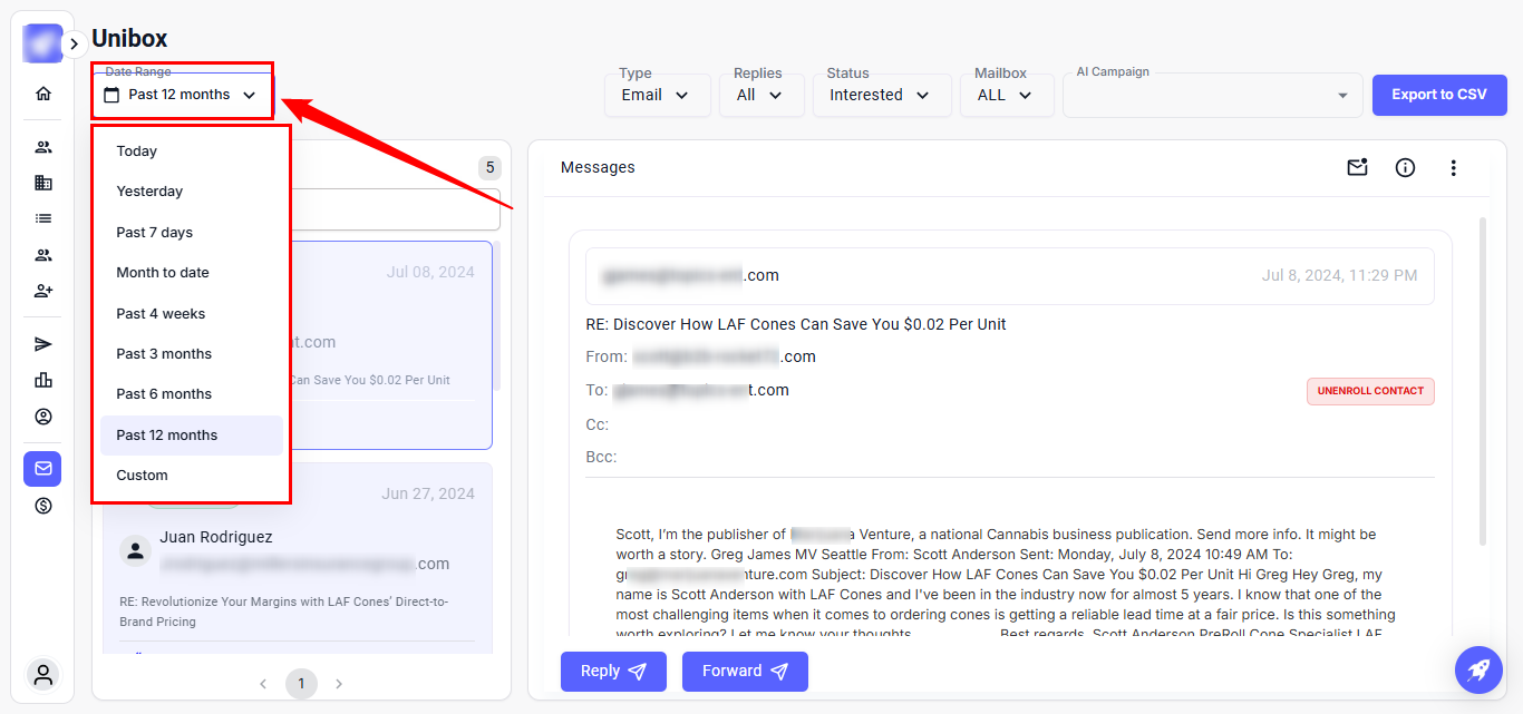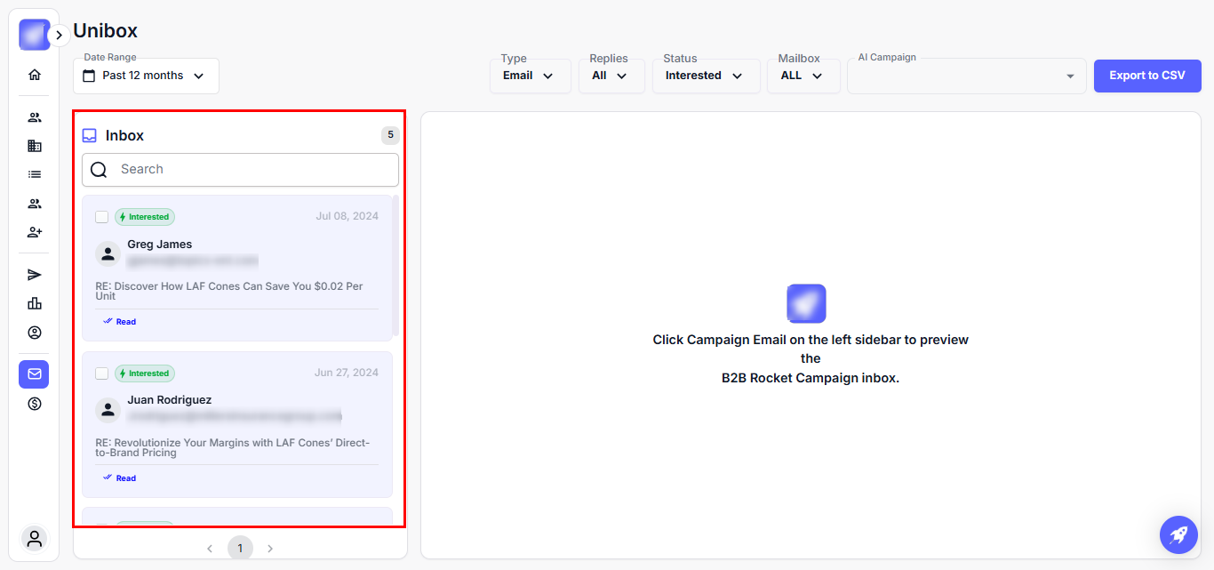 Click the Export to CSV button (top right) to download the filtered inbox data as a spreadsheet. This is useful for sharing with your team or importing into a CRM.