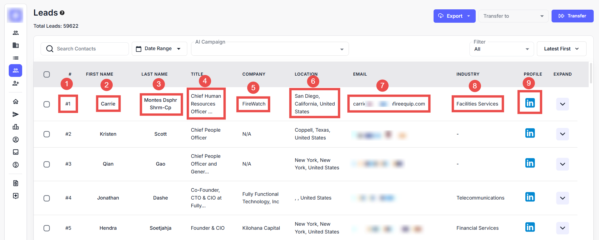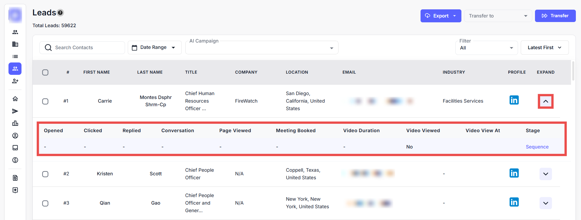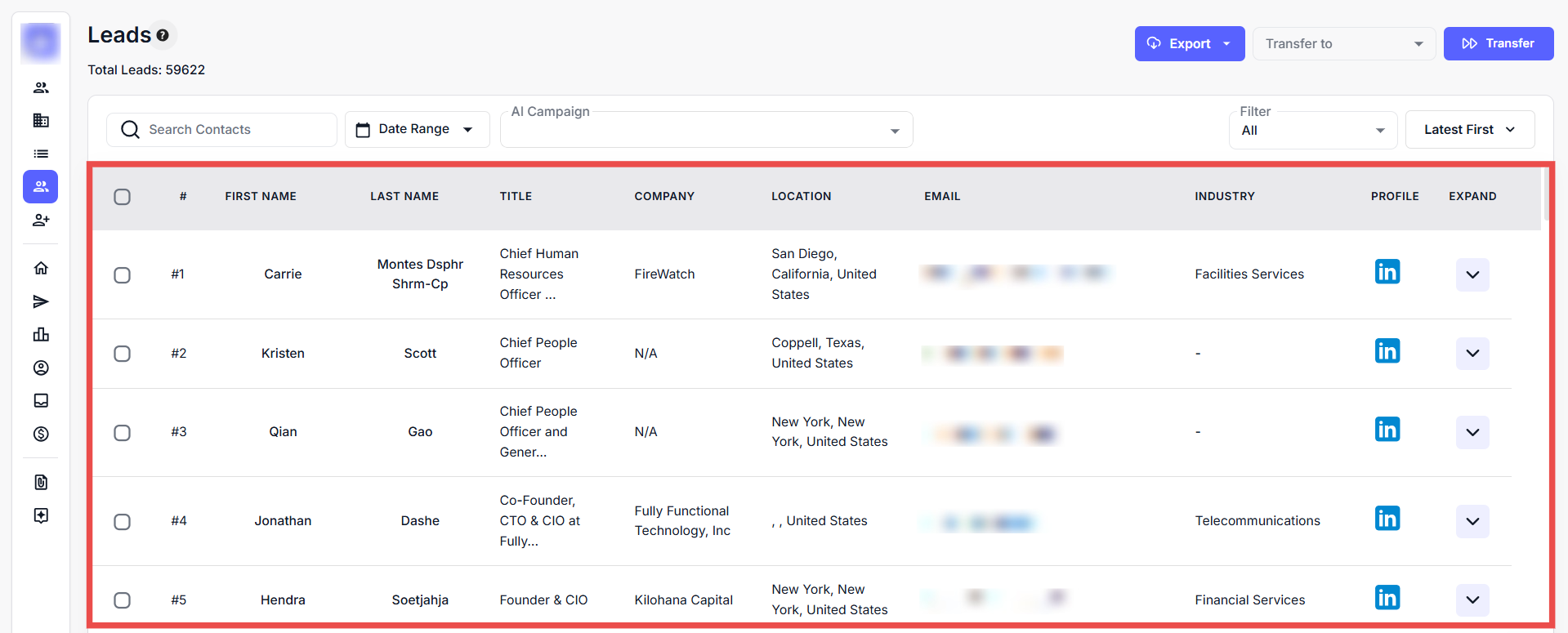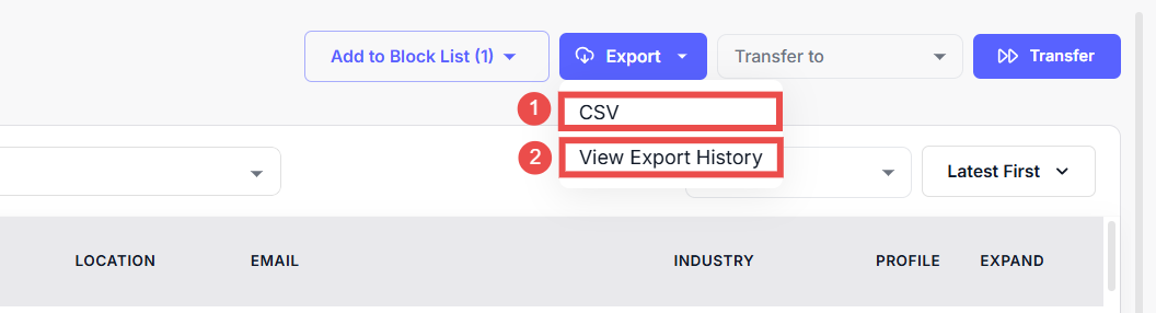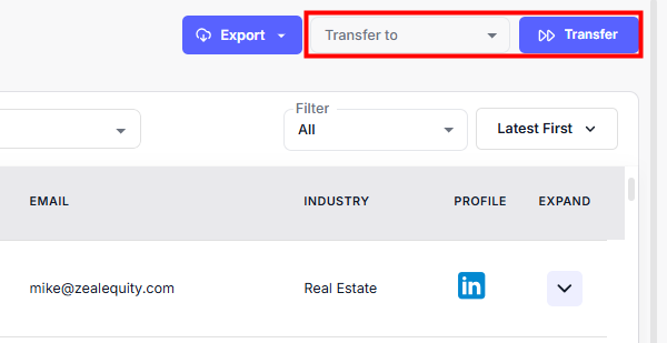 The Transfer to option allows you to move selected leads directly into connected CRM platforms for streamlined management and tracking.