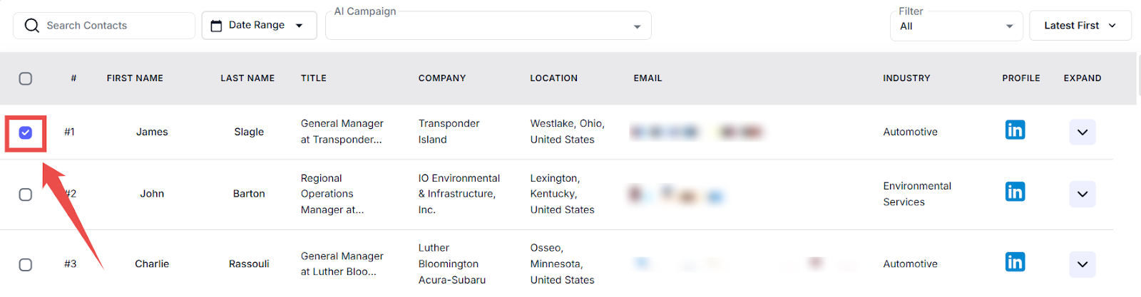 Step 1: Click on the checkbox next to the lead(s) you want to export.