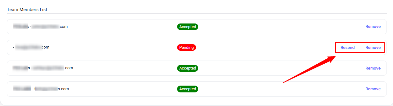 This displays all the individuals who have been invited to your workspace, along with their current invitation status and available actions.