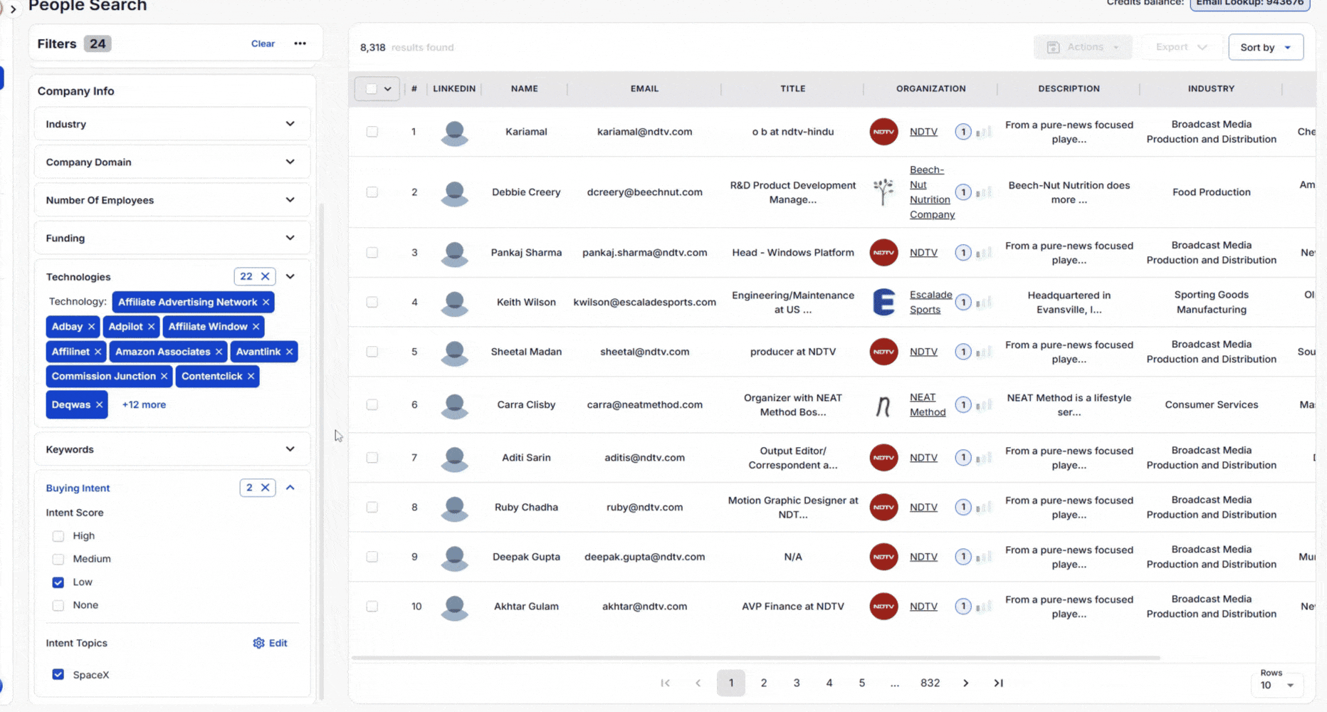 Example: Filter companies using Affiliate Advertising Network tools like Adbay, Adpilot, Amazon Associates, and Avantlink, while focusing on those with a low buying intent score and an intent topic related to "SpaceX." This helps you target companies that are aligned with your offering but may not yet be ready to purchase.