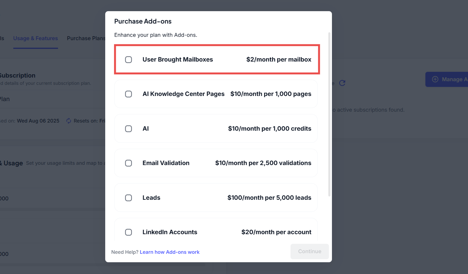 Users can now connect their own mailboxes for sending emails, offering more control and cost efficiency. Each connected mailbox is billed at $2/month and displayed in the billing details for transparency.