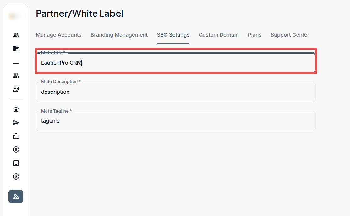 Custom titles, descriptions, and taglines help your white-labeled platform appear correctly in search results through SEO settings.