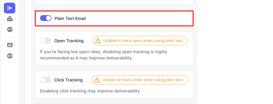 A: If Plain Text Email was turned on, tracking features are automatically disabled because they require HTML formatting. You won’t get any open or click data unless the email was sent in HTML format with tracking turned on.